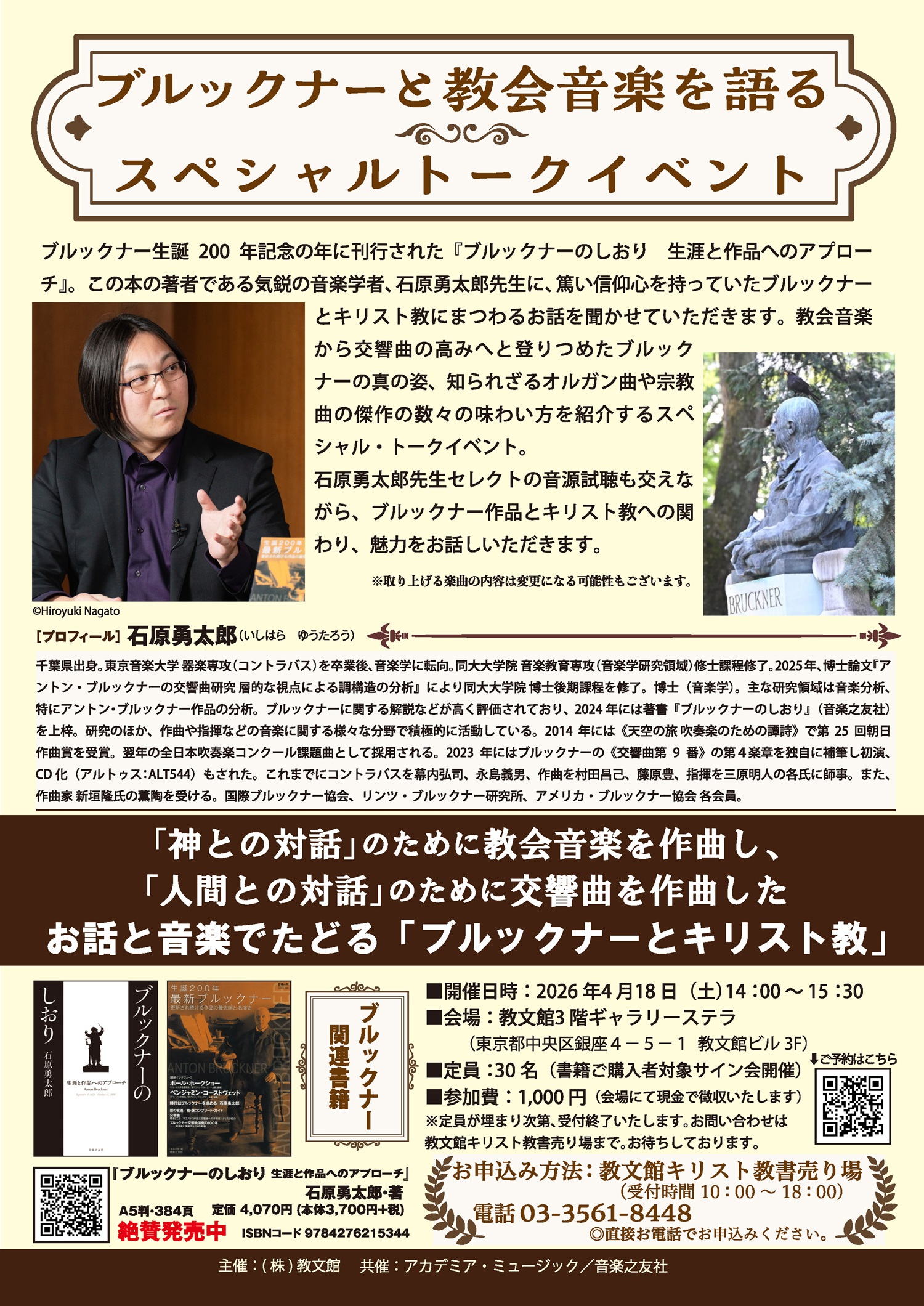 『ブルックナーと教会音楽を語る』スペシャル・トークイベント開催!! ブルックナー生誕200年記念の年に刊行された『ブルックナーのしおり 生涯と作品へのアプローチ』。 この本の著者であり、気鋭の音楽学者、石原勇太郎先生に、熱い信仰心を持っていたブルックナーと キリスト教にまつわるお話を聞かせていただきます。 教会音楽から交響曲の高みへと登りつめたブルックナーの真の姿、 知られざるオルガン曲や宗教曲の傑作の数々の味わい方を紹介するスペシャル・トークイベント。 石原勇太郎先生セレクトの音源試聴も交えながら、 ブルックナー作品とキリスト教への関わり、魅力をお話しいただきます。