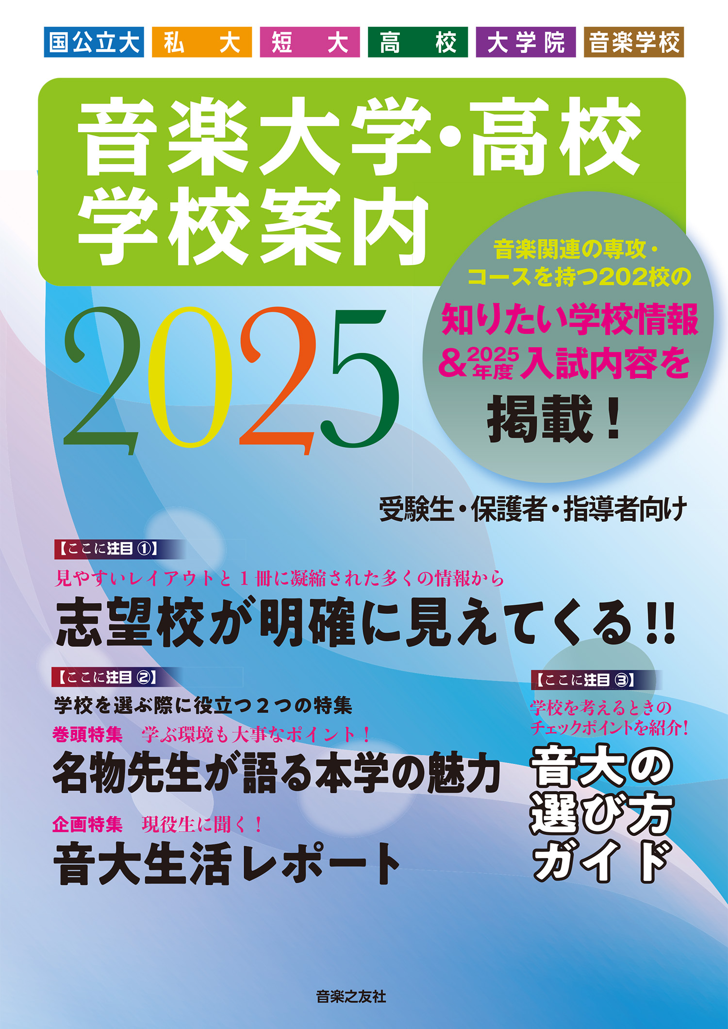 先輩の音大生は、なぜその学校や専攻・コースを選んだの? どんな毎日を送っているの? 将来の夢は? そんな音大志望者にとって気になる“音大生の生態”を、人気進学先7大学11名の先輩たちが本音トーク! 読者の皆さんの志望校選び、入学後をイメージした受験勉強への闘魂注入にどうぞお役立てください!!